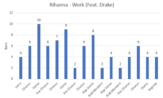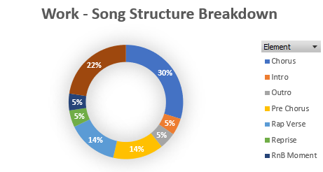 Breakdown of the different song elements. Almost half (44%) of the song is chorus and pre chorus. While 36% of the song is the verse.